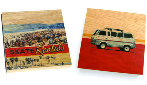 Sean prints on various wood surfaces including Birch, sanded plywood, and general plywood. The printer prints directly on the surface of the wood. The ink dries immediately when it hits the surface. After the wood has been printed on, he then seals it with several coats of a waterbased UV Polyacrylic sealer – matte finish, which is crystal clear and environmentally friendly.