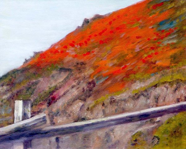 In Southern California, we have a very prominent summer. It is HOT, it is STICKY, it can be dry and it is also what brings the abundance of tourists and visitors to our state. They come for the beaches, and the sunshine, Hollywood, and the fame. This painting reminds me of those places in Hollywood Hills or along the way, hidden in back, upper class neighborhoods that mimic a calm, rural life, but are far from it. The luxury of the quiet being a benefit of the fast paced and rich lives celebrities live.