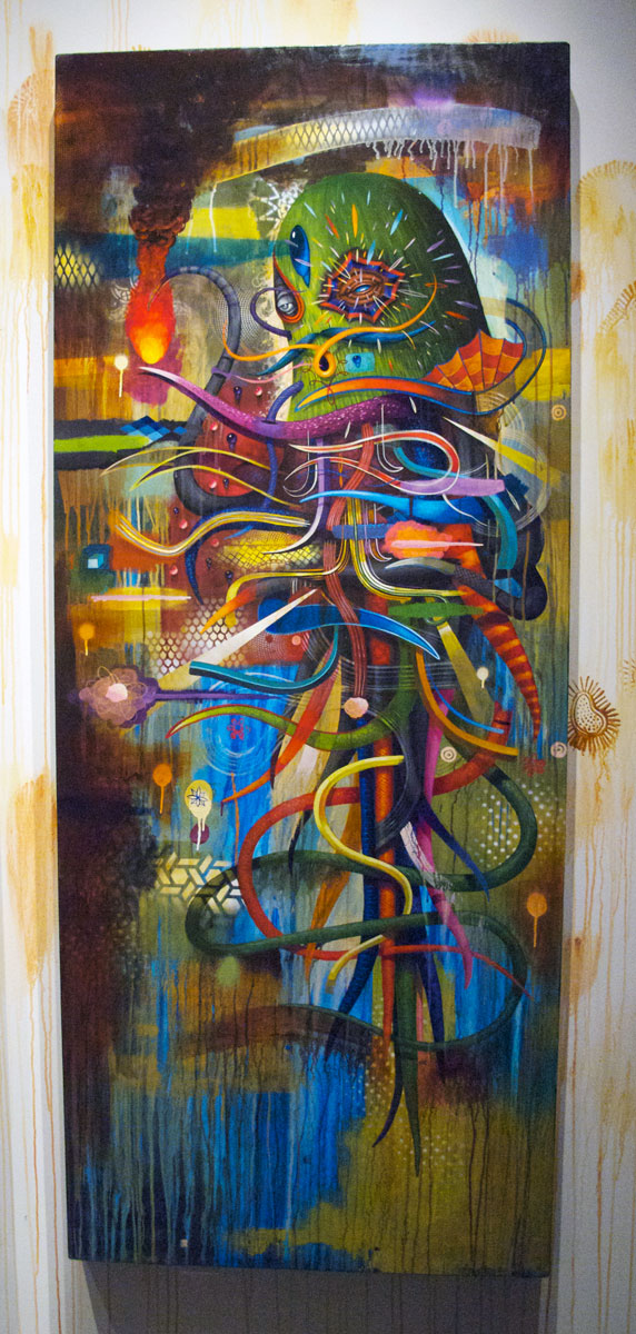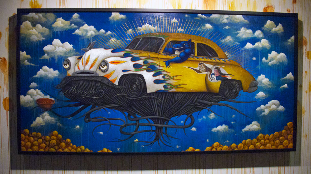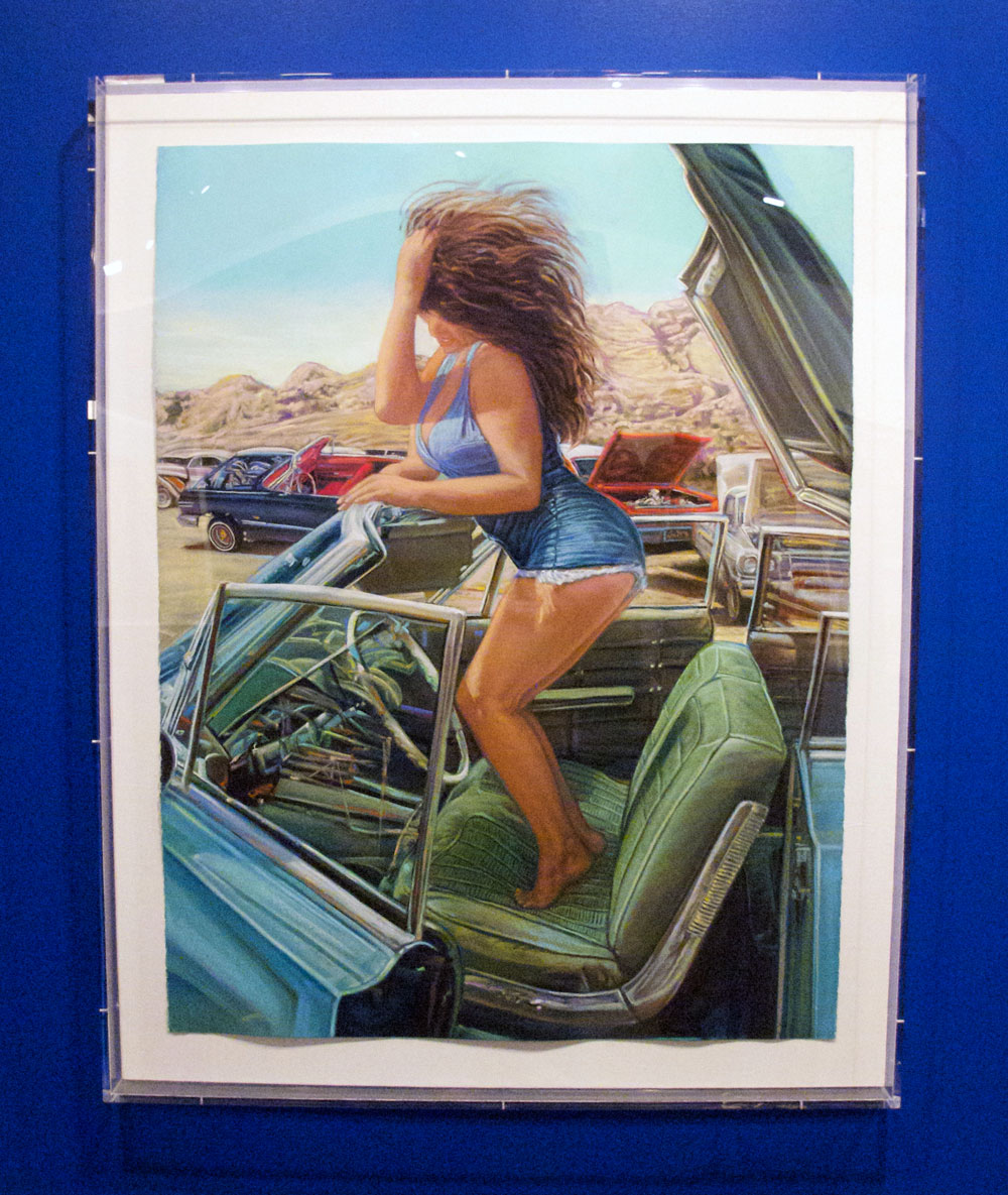 Then, the future of Chicano art is displayed with Jaime Zacarias, aka GERMS in the Hoy Space gallery. His surrealistic images take you to another world that is futuristic with its amoeba-like characters. Favorites are his work depicting “Los Doyers” and upon walking into the Hoy Space gallery, an acrylic on wood and tribute to the late Chicano artist Gilbert “Magu” Lujan of a Chevy from the 50’s. All must see exhibits for those who follow and collect Chicano and Los Angeles art.