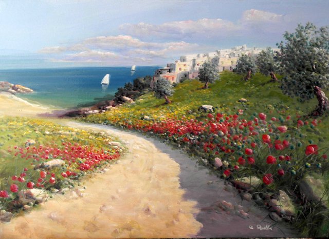 Antonio Anelli is a landscape painter , he plays with colors soft but full light of the typical landscape of his homeland , painting white houses and rocky terrain. His painting lives of the emotion of the past and present , of that emotion in him that is timeless. Antonio Anelli captures and transfers us with a sure hand all this, in its genuineness of expression , in contrast with today’s civilization , withered barbarized .