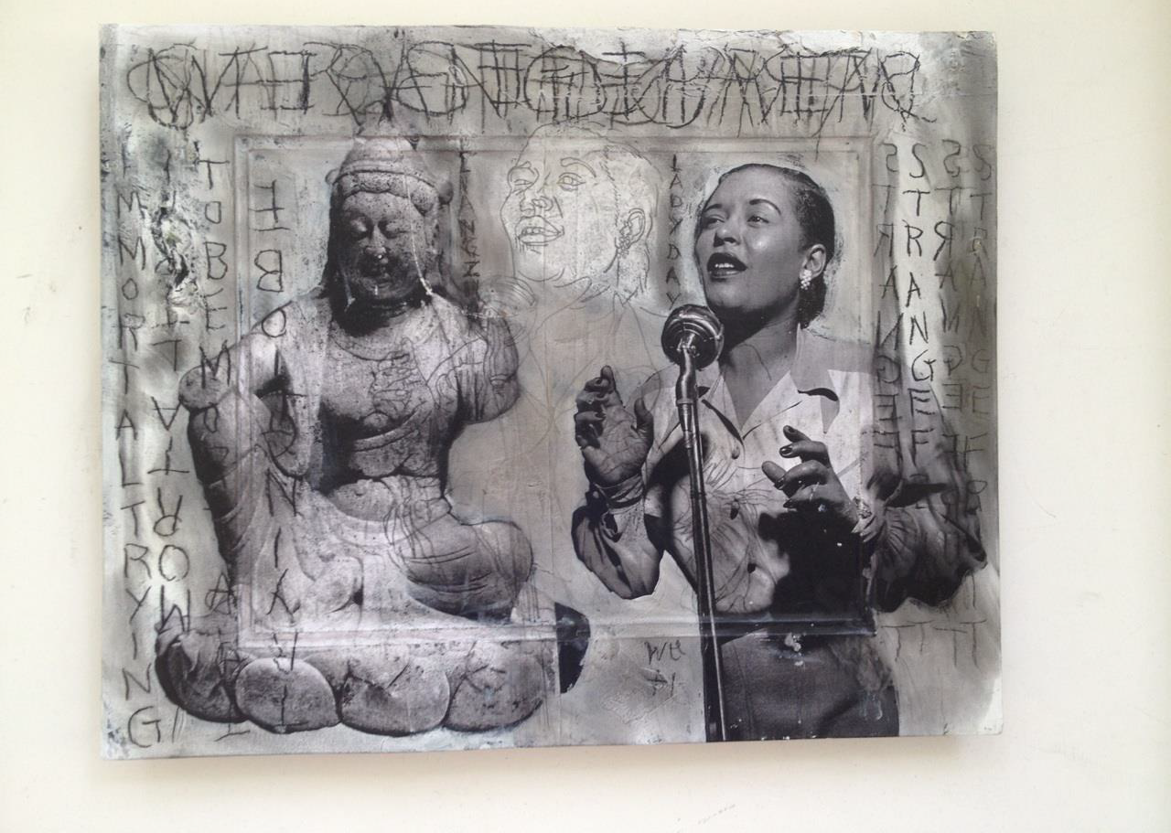 for decades with the Charlie Chan Blues Band. His visual language is a complex collage-based, paint-draw
