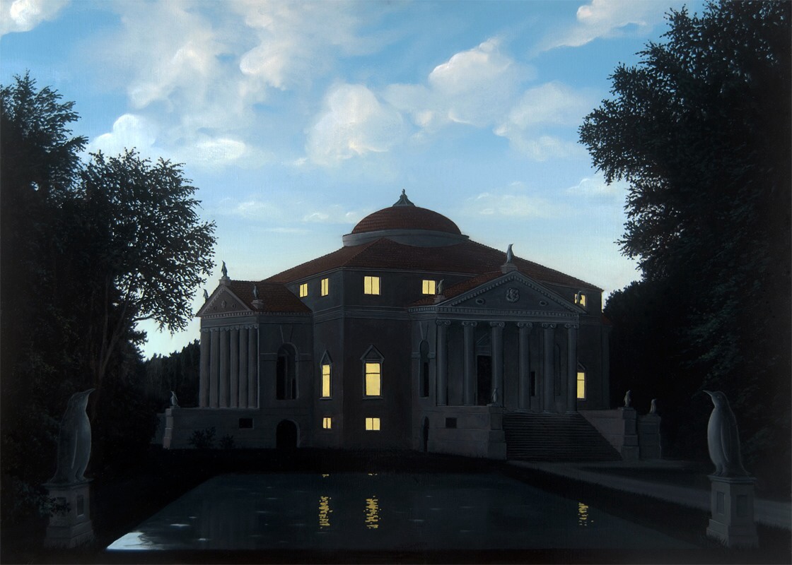 In this tribute to one of the great Italian Renaissance architects, the famous Villa Capra of Vicenza, also known as The Rotonda, the artist substitutes the statuary on the facade with penguins. In the Italian title, Pinguini paladini, the artist plays with the rhyme and harmony between the birds and the name of the great architect Andrea Palladio (Palladio/Paladini), well aware of introducing the actual theme, the risk of extinction of a protected species. Paladino literally means, protector of the palace. Those who should be protected, the penguins in danger of extinction, become the protectors according to an overturned logic, typical of today’s reality where the bending and the flip-flop of values is a recurring and aberrant practice.