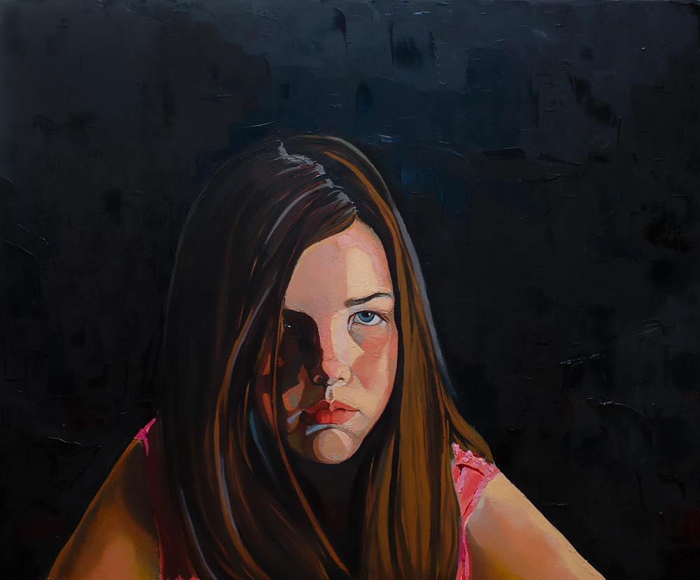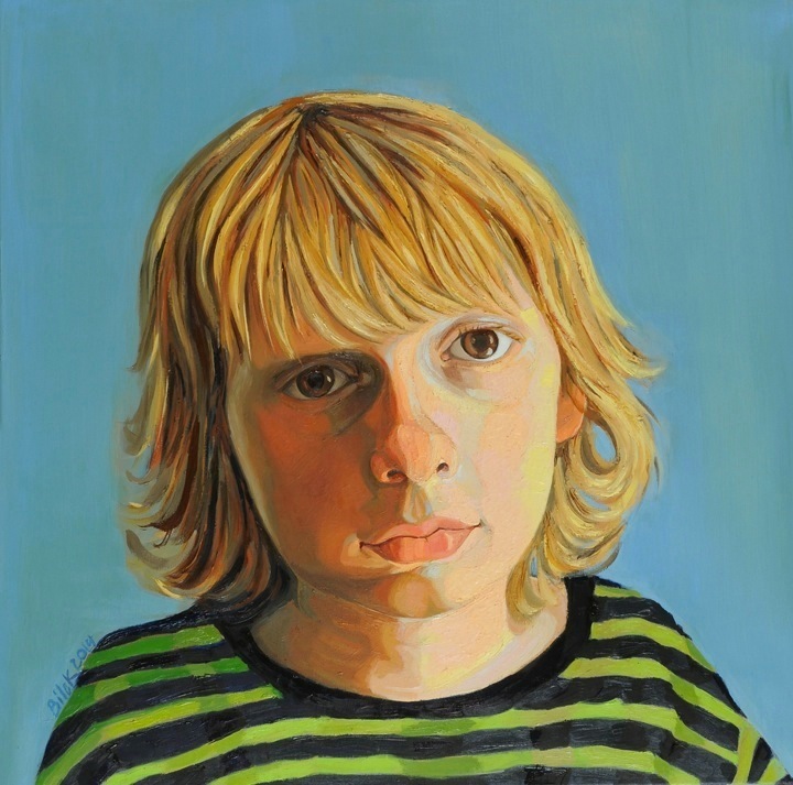 The use of a cooler color palette creates that nostalgic feeling. Even the greyish-blue shadowing of his right eye seems like a fun summer injury, if interpreted as such. Portraiture in this style lacks considerable detail, of the hair for instance; rather the style is expressive and playful. The shapes of color along the boy’s cheeks, nose, lips and chin remind me of Chuck Close’s use of hue interpretation and abstract expressionism, signatures of his photorealistic portraits.