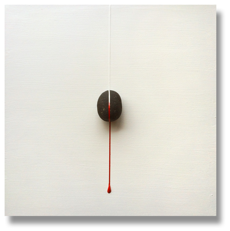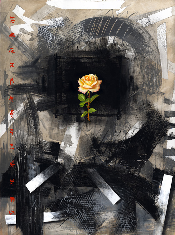 The “Inner Structures” paintings, for example, almost always follow a sort of compositional template in which a single, tightly rendered object/images borrowed from his classical phase — a rose, a pomegranate, a human heart — rest atop, or rather hover above variations on abstract, atmospheric color fields, like weather systems built of mark-marking, or boxes of rain. Although there are divergent styles and techniques in play, Grasso choreographs a deft interplay between