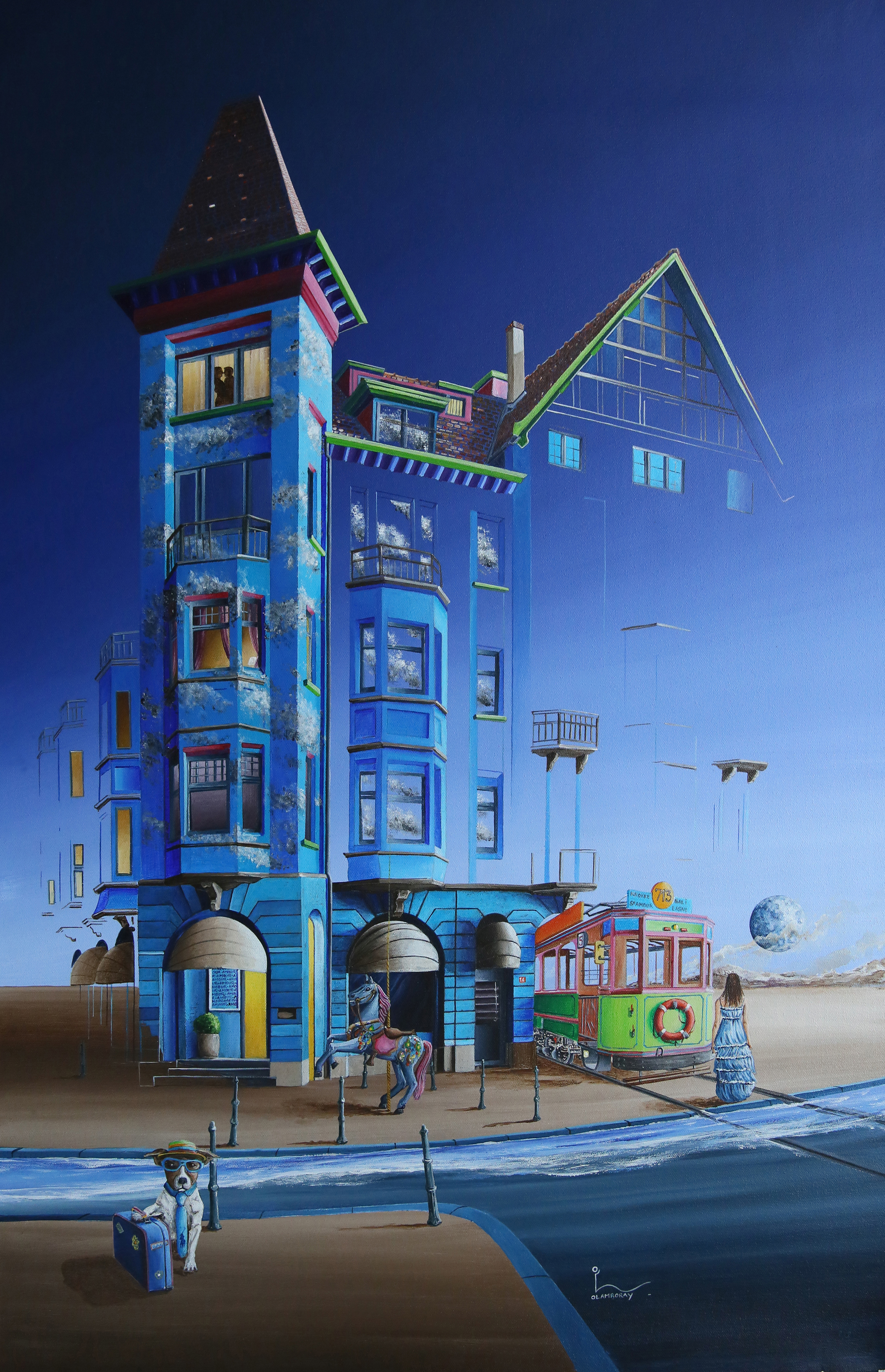 After 22 years of work, study and research, I finally managed to lighten my architectures, breaking walls, out of the rigidness of the street and open up to deeper horizons. I prefer my architectures to evaporate, and mix with the clouds, with the decor, more peaceful sensation of this dual world we live in, between dream and reality. A compassionate approach of this world, where the value of animals is transmitted by their presence in my stories as an integral part of my life. Love, blowing a positive blue wind enchants the scenery, and the presence of a huge Moon, connecting us to the Greatness of the Universe.