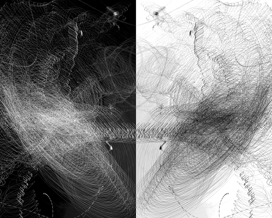 Art critic Peter Frank writes about Mr. Lew’s work, “In each of his Light Drawings, to paraphrase Paul Klee’s famous phrase, Lew goes for a walk with a line. Or, more to the point, he goes for many walks, and runs, with any of several lines. The density of linear activity Lew captures, left as such or enhanced, can describe not just arcs and traces, but thick textures and surging luminescences, ineffable atmospheres and ominous spaces. Lew’s images often suggest the tangled notations of a multi-pronged Rapidograph pen. But nowhere do they rely on the physical earmarks of drawing – variations in pen pressure, the vagaries of ink, or even the grace of the artist’s hand. Rather, they concentrate our attention on the appearance of line itself – line as image, that is, not as notation, as webs of paths rather than as traces of gesture, reflections on rather than records of movement.”
