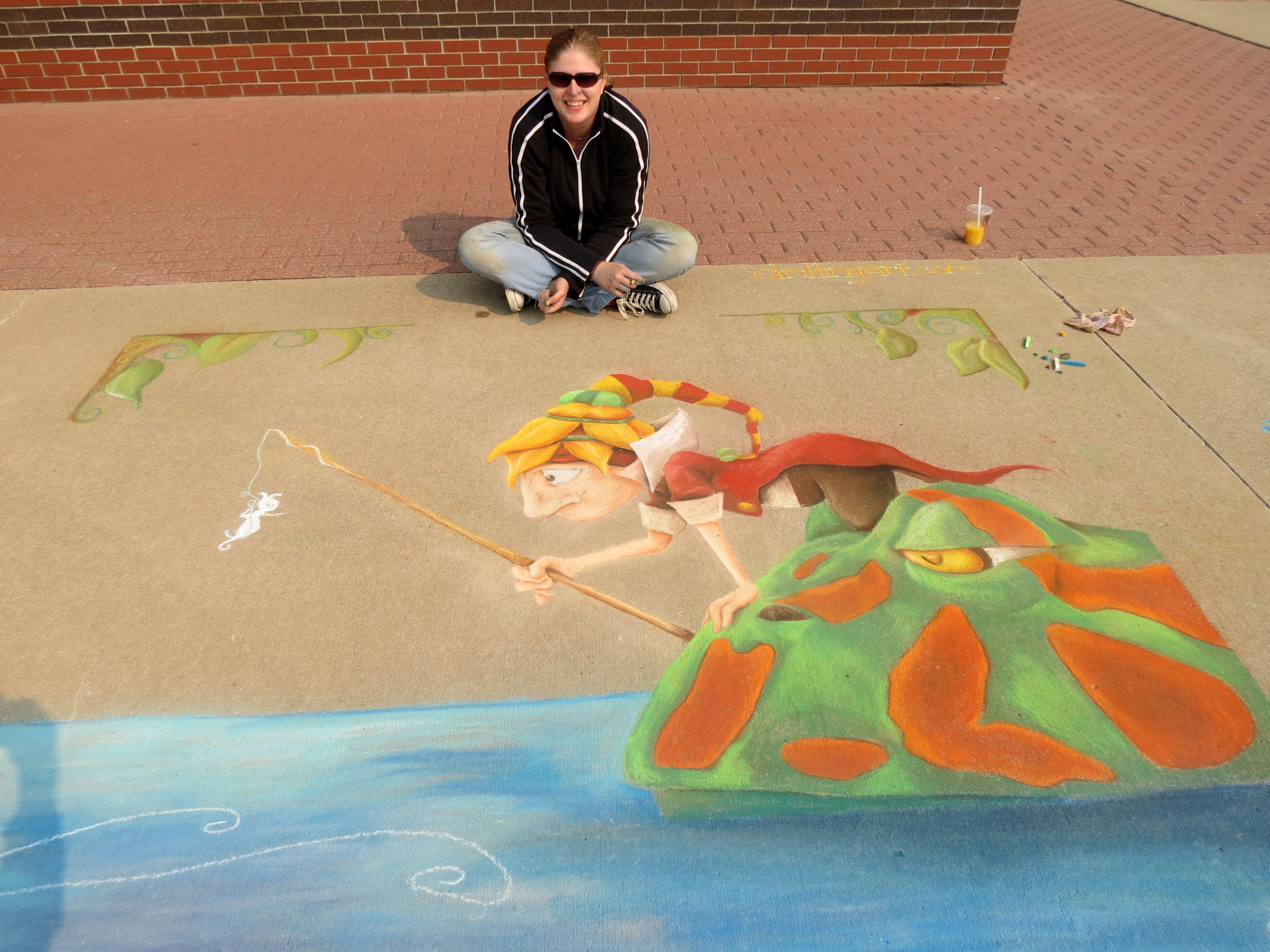 A couple of years went by and slowly my artistic drive shriveled away to near nonexistence. That’s when a friend finally convinced me to participate in a Chalk Art festival out in Iowa. Every artist was given an 8 x 10’ square, a box of chalk pastel and let loose to create whatever whim they desired. This was a big turning point for me. Completely unsure what I was going to draw at this festival I sat down and started sketching for the first time in who knows how long. That’s when I FINALLY turned off the serious side of my artistic training and learned to let go and just have fun! The little characters that came out of that moment have been a part of my life ever since (as has the festival).