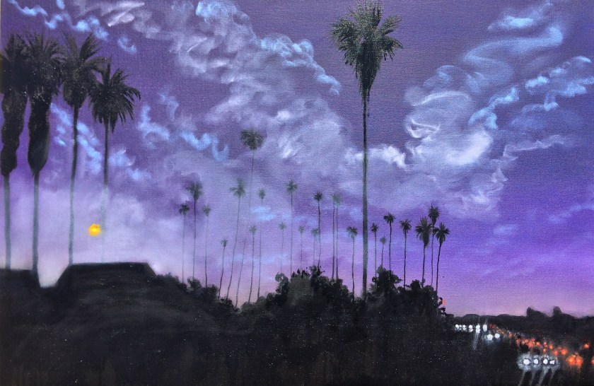 Sandy Rodriguez’s paintings are quintessentially Californian. Palm tree silhouettes stand amidst the atmospheric fog, fire, sunsets and sunrises of the Los Angeles skyline. Immensely saturated, Rodriguez captures billowing blue clouds set against a violet sky, and the prismatic orbs of refracted light during a midnight drive. Each painting is a vision of Los Angeles, and exudes the essence of moving through the city.