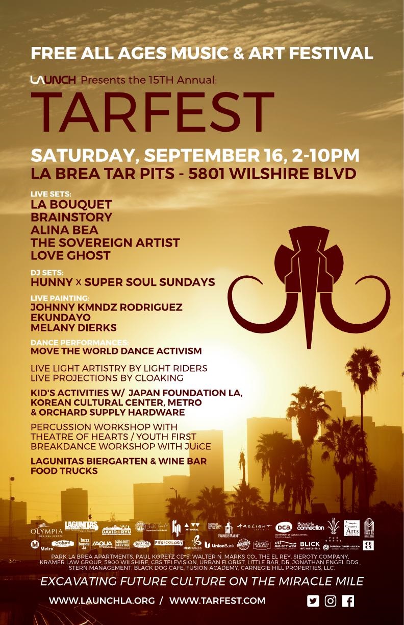 Los Angeles, CA – LAUNCH LA, with tremendous support from its sponsors and the local arts and business community, presents the 15th annual music and art festival, TARFEST 2017, which returns to the La Brea Tar Pits Park on Saturday, September 16th (2-10PM). Open to ALL AGES and FREE to the public, TARFEST celebrates local artists, musicians and culture with performances by headliner La Bouquet and opening acts Brainstory, Alina Bea, The Sovereign Artist and Love Ghost. The event is once again curated by the non-profit arts organization LAUNCH LA and Kevin Bronson of BuzzBands.la.