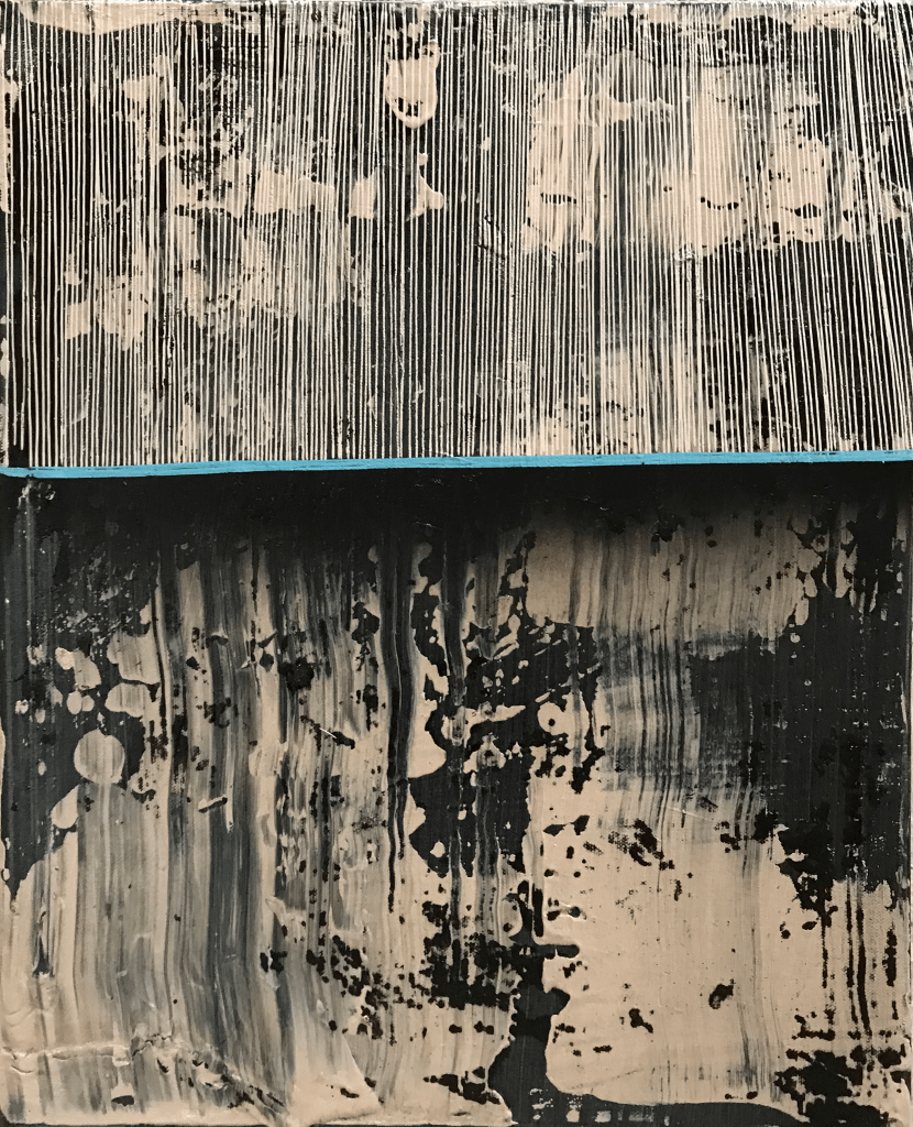 Breaking away from the neon palette of his his previous canvases, the variations of color and line appear as two different series in opposition with one another as a nod to the exhibition title, Tribe. These contrasting approaches are meant to mirror a Global Village where conflict becomes more visible through the depiction of painting styles at odds. Yellows and oranges are juxtaposed against deep blues and black drips in the Crudo series, while light blues run as thin horizontal lines across darkened black and grey backgrounds in smeared patterns in the Data Refiner series.