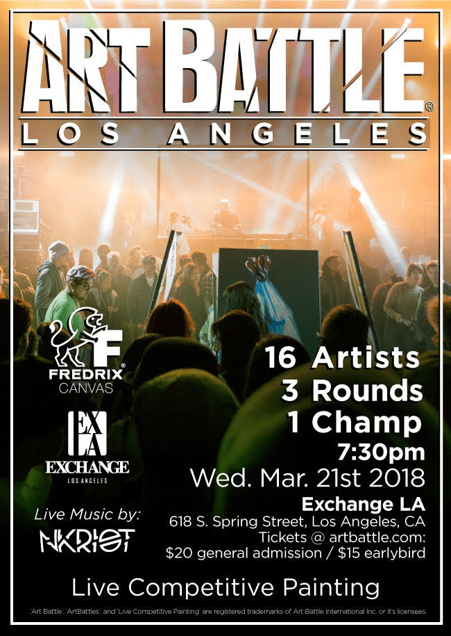 Join us in DTLA for an incredible night of live competitive painting held monthly at the stunning Exchange LA! Painters have 20 minutes to turn their canvases from blank to beautiful, the audience votes to pick our winner, who wins a cash prize, and secures a position in the LA City Finals. It’s always new and unique, an inspiring night of creation and community.