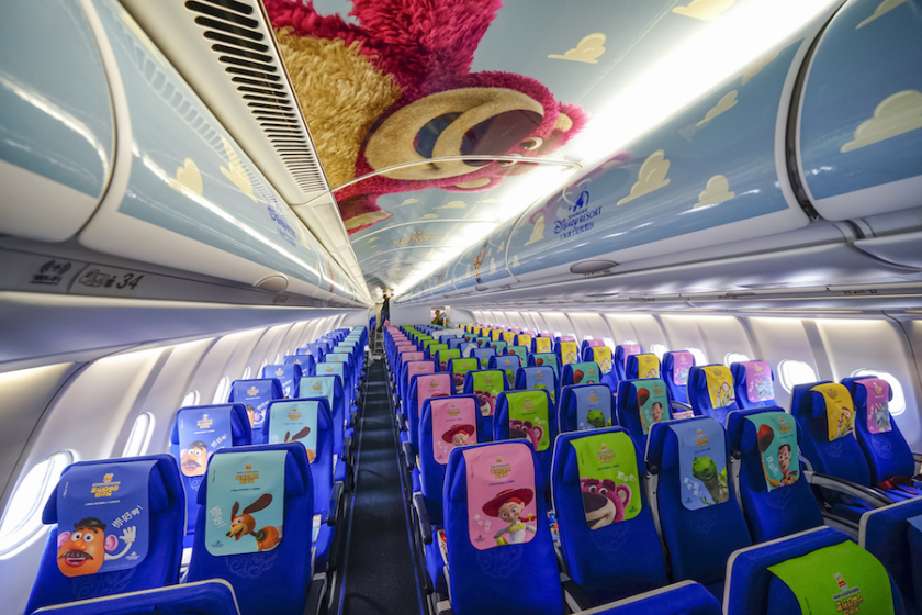 The first Disney·Pixar Toy Story Land themed plane took flight from Shanghai over the weekend, featuring in-flight entertainment and colorful décor that illustrates the new attractions now open at Shanghai Disney Resort. Even the ceiling is decorated for this special flight experience!