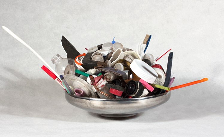 Using ubiquitous pieces of plastic like bottle caps and straws found on the roadside, along the beach, or in my own house, I created Part of a Complete Breakfast to make a statement about the ever-present nature of plastic. In the ocean, some of the plastic sinks, and some of it gets broken down by the sun and waves, but never completely disappears and thus gets eaten by fish, turtles, and mammals. It threatens the marine life, the ocean’s ecosystem and, ultimately, us.