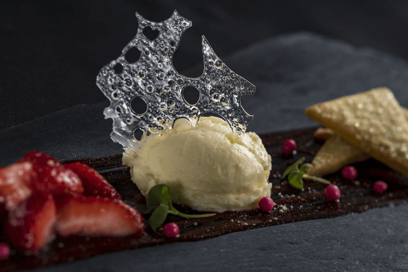 Deconstructed Strawberry Cheesecake: Whipped New York Style Cheesecake with Fresh Florida Strawberries, Sugar Cookies and Micro-basil