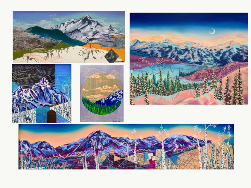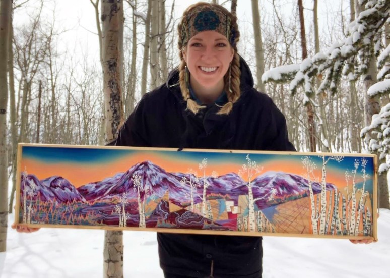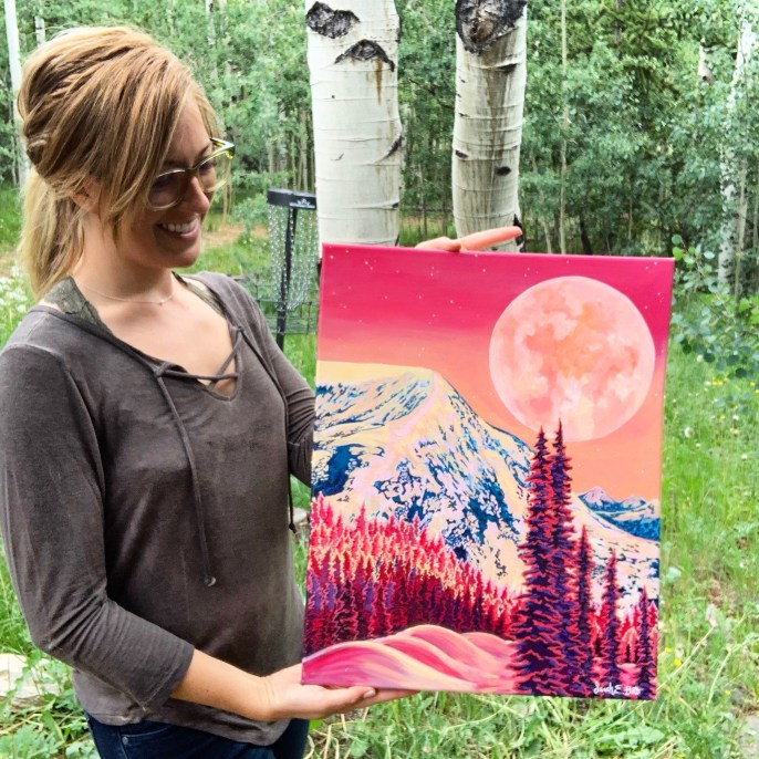 That’s when my fiancé and I decided it was time to buy a house so that I could have an in-home studio all to myself. We bought a beautiful little mountain home in Fairplay, Colorado where we currently reside. We’re surrounded by aspen forests and hiking trails in the most beautiful area. Every day I walk out my door I am inspired and grateful for everything we have. I spend majority of my time focused on my art business and am having so much fun with creating all the time. I still coach skating as well in Breckenridge on the side. This keeps me working with kids in a sport I love as well as gives me some consistent socializing. In our free time, my fiancé and I love to spend time adventuring with our two dogs, rock climbing, snowboarding, camping and doing various other outdoor activities. I hope people who view or purchase my work feel joy, a connection to nature, a need for adventure and the desire to live environmentally conscious.