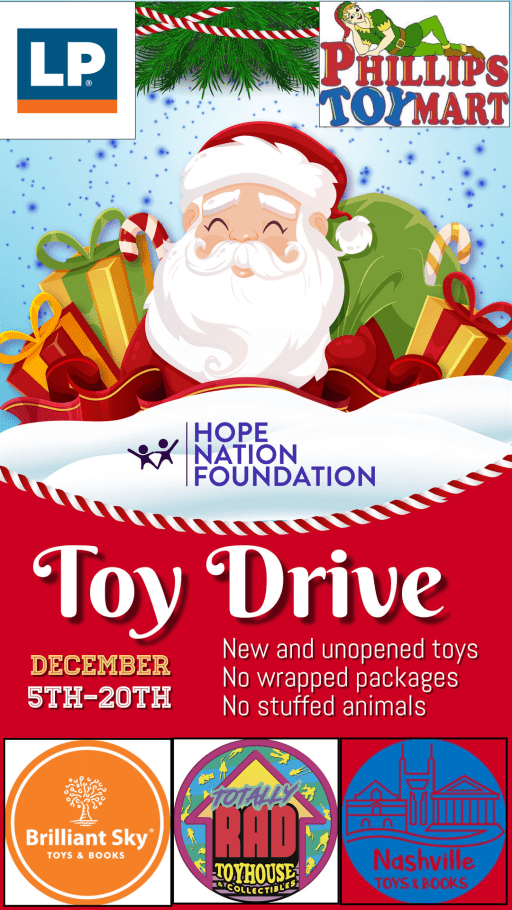 Hope Nation Radio is bringing Christmas to childhood families all over the Nashville area. Multiple toy donation drop off points are available for you to drop off a new, unopened toy until December 20, 2020. These toys will be wiped down for the children’s safety (to follow Covid protocol). Please no stuffed animals or gift wrapped presents. Semi-trucks are ready for pickup and delivery. 2020 will NOT take Christmas from these kids. Here is to closing out this year with HOPE!”
