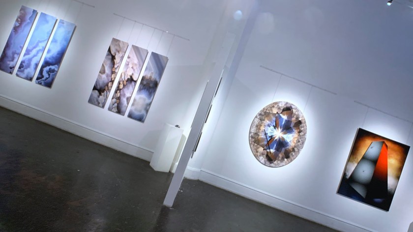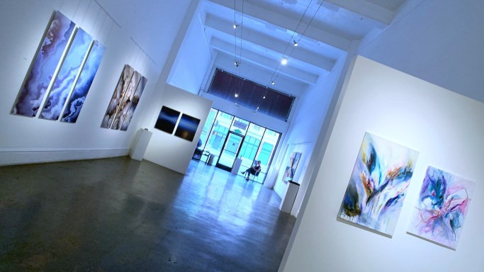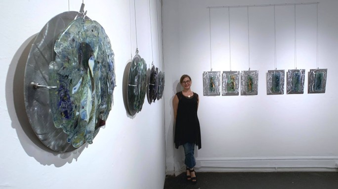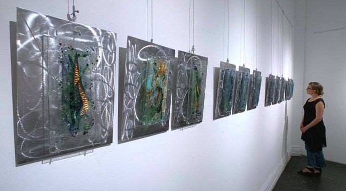 “Water and glass share sister spirits, transparent, liquid, and constantly flowing. They are beautiful, dangerous, and can never be completely controlled. I am drawn to both by their siren song, and my moods are held captive by their powers… “Splash” celebrates water’s happy side. This bubbly word conveys excitement, energy, and spontaneous fun, and life should be bursting with all of it. From ocean waves to pool parties, this show is all about dancing water, sunny days, and lots of brilliant color. With abstract images that conjure up portals and whisper the essence of the sea,,and bright, whimsical sea creatures frolicking at an ocean swim party, this show invites you to come out and play.”