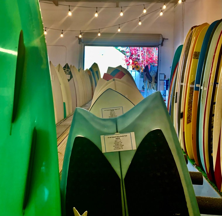 Tapping the source of local progressive surfboard shapers and energy of the emerging men and women pro surfers in this small town, surfer/owner Don Pearson is offering surfboard choices to the new and experienced surfer. Buying from a surfer and someone who knows surfing and surfboard shaping is an easy path to happiness. Stray Boards provides knowledge to the surfer who is seeking a surfboard to progress on, as well as provide an inventory of performance short, mid length and long boards to those who know what they want. I was very surprised at the great selection of the universal ‘Fish’ surfboards as well as the fine-tuned and foiled ‘Mid Length’ surfboards. In a world of typical trendy, white, cloned, ghost shaped shortboards, this shop had a glorious range of color and inspiring artistic resin tinted beauties at a great price.